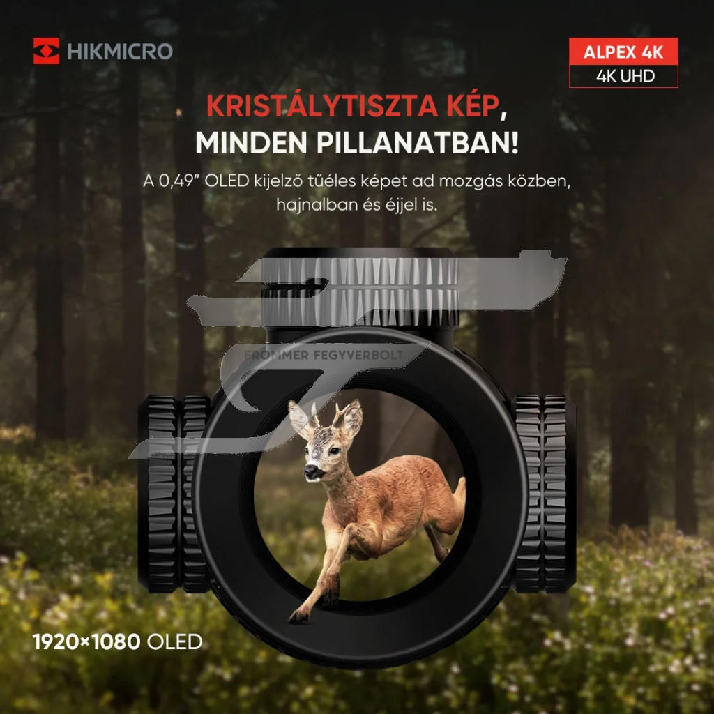 Alpex éjjellátó 4K felbontású érzékelővel szerelt változat, beépített 1000m-es lézeres távolságmérővel. A Hikmicro Alpex külsőre úgy néz ki, mint egy hagyományos céltávcső, ez a Hikmicro széria első 4K képfelbontású digitális éjjellátó céltávcsöve. Fontos tudni, hogy a kamera fő elemének számító éjszakai/nappali képalkotást végző érzékelőelem technológiáját a Hikmicro anyavállalata a Hikvision amely a világ legnagyobb kameragyártója már hosszú évek óta feljeszti, biztonságtechnikai rendszerei részére. Ez a hosszú évek alatt megalapozott tudás óriási előnyt jelent az alapból „vadászati” célú versenytársaival szemben. A szenzor 4K azaz 3840×2160 pixel felbontású és rendkívül nagy érzékenységű. A kijelző a korszerű új formátumú kerekített kialakítású 0,49ˇ-os OLED technológiára épül és 1024×768 pixellel rendelkezik. Az 50 mm-es frontlencse és az okulár 3,5x-es optikai nagyítást ad amit a digitális zoom funkcióval 7/14/28x-os értékre nagyíthatunk._x000D_